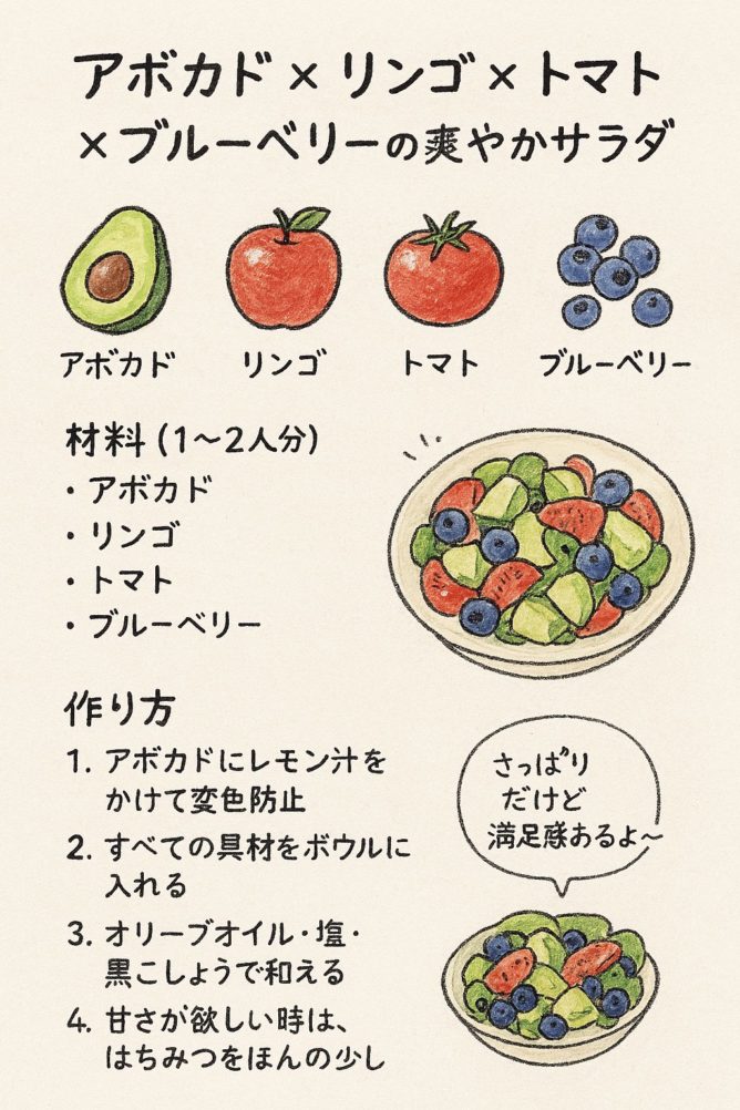 - アボカド+トマト+りんごのサラダ:噛みやすく、血糖値にやさしい組み合わせ