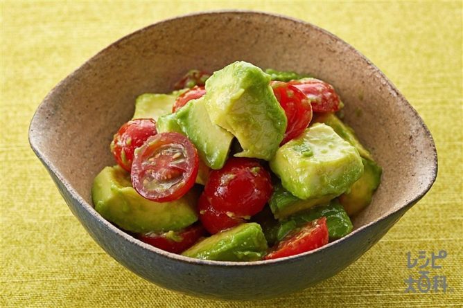 - (2)ボウルに(1)のアボカド・ミニトマト、Aを入れて軽くあえる。