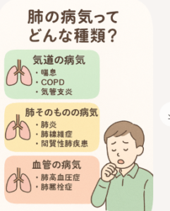 肺の病気はとても種類が多いですが、検索結果の医学情報をもとに、わかりやすく分類 → 主な病気 → 症状 → 注意点の順で整理しました。