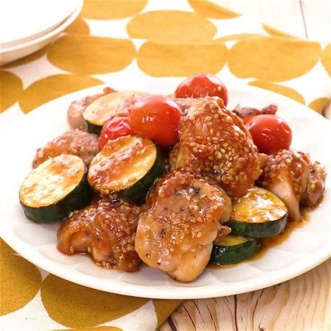 もも肉 ズッキーニ ミニトマト 塩こしょう 片栗粉 サラダ油 酒 砂糖 酢 しょうゆ ケチャップ 白いりごま