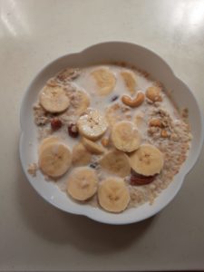 朝食にオートミール(牛乳、ナッツのアソート、レーズン、バナナ)を取り入れ、植物繊維や野菜を多く含む食事を心がけることが大切です。