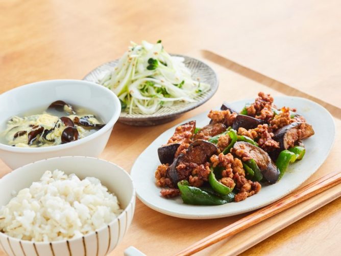 なすのピリ辛みそ炒め・やみつき ねぎサラダ・ふんわり卵ときくらげの中華スープ ・麦ごはん(押麦3割・150g)