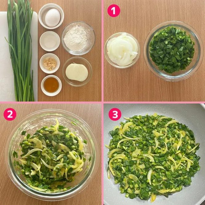 ニラは1センチ幅に切り、玉ねぎは薄切りにする。