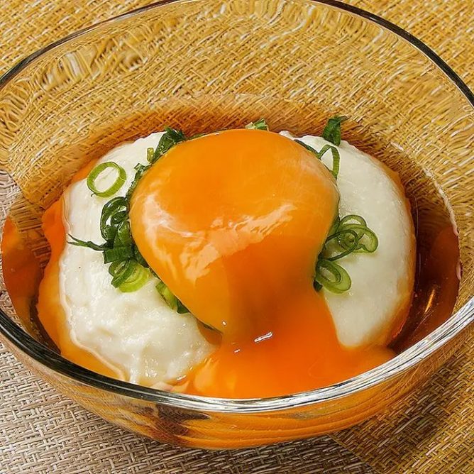 ④ ③を食べやすい大きさに切り分けて器に盛る。仕上げにめんつゆ、小ねぎ、卵黄をのせたら、完成!