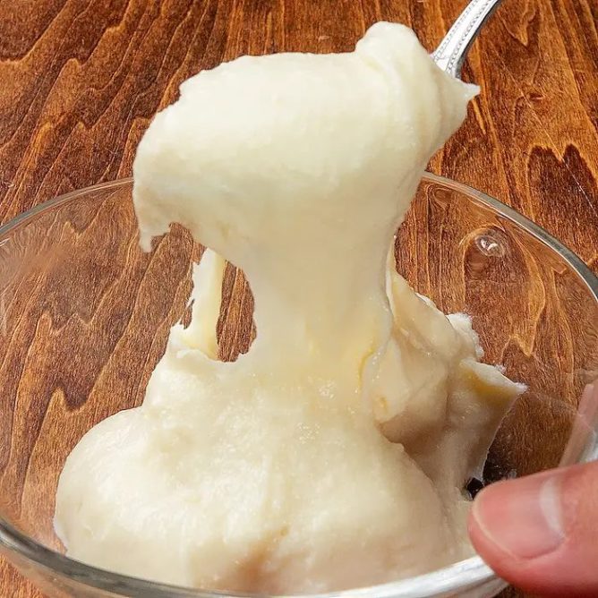 ③ 全体的に滑らかになりツヤが出てきたら、ラップを被せたバットに流す。粗熱をとってから上にラップをかけて冷蔵庫で3時間ほど冷やす。
