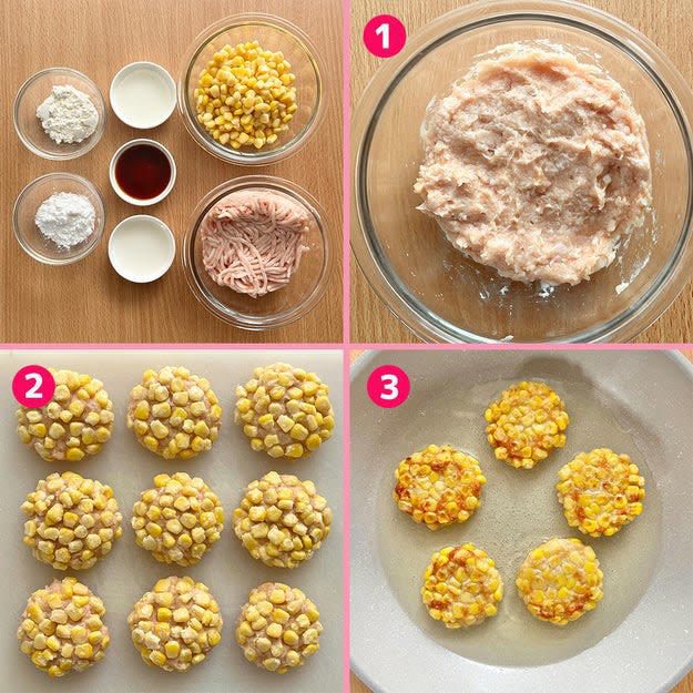 ② ①を9等分にして丸めたら、片栗粉をまぶしたコーンをまとわせる。