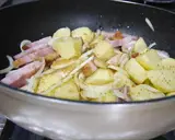 じゃがいもをレンジで5-7分加熱したらフライパンでオリーブ油で残りの具と混ぜ合わせ、塩コショウ、コンソメで玉ねぎがしんなりするまで炒める